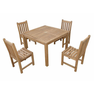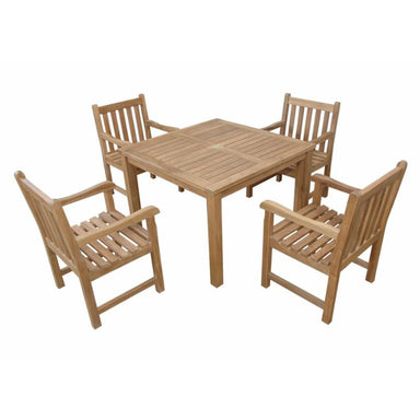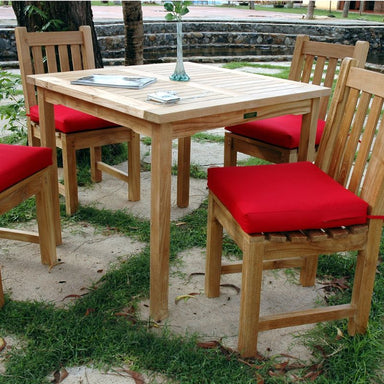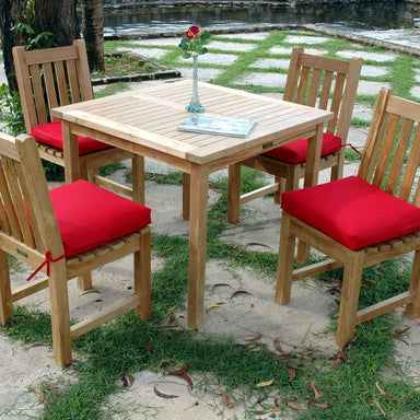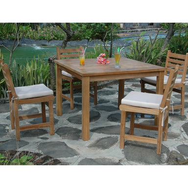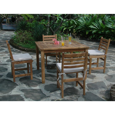 The perfect teak outdoor dining set for the patio or yard, this bistro set includes a Bahama 35” Square Table and four Chicago Dining Armchairs. Ma...